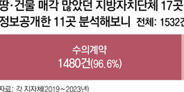 동아일보가 최근 5년간 세외수입 중 재산매각액 의존도가 높았던 시군구 17곳을 상대로 정보공개를 청구해 11곳의 자료를 분석한 결과, 전체 매각 건 가운데 96.6%가 수의계약인 것으로 확인됐습니다. |