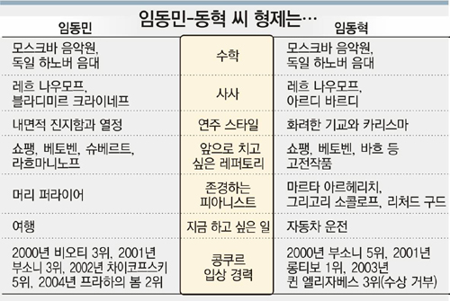 동민 동혁 씨 형제는 ‘부잣집 아이들’이 아니었다. 어머니 박현옥(50) 씨의 말에 따르면 부모는 피아노의 ‘피’자도 몰랐던 사람들이다. 형은 10세, 동생은 7세 때 처음 피아노를 배웠다. 이들 형제는 1994년 삼성물산 건설부문 모스크바지사장으로 발령받은 아버지 임홍택 씨를 따라 모스크바음악원으로 유학을 갔다. 임 씨는 “두 아들을 피아니스트로 키우는 것이 봉급생활자로서 쉽지 않은 일이었는데 삼성문화재단에서 재정적으로 큰 후원을 해 주었다”고 말했다.