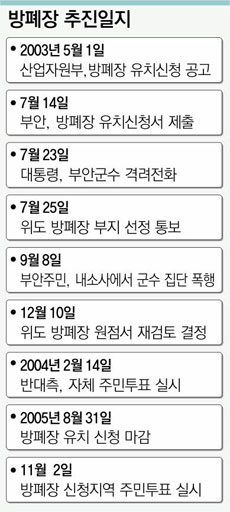 2003년 7월 전국에서 처음으로 중저준위방사성폐기물처분장(방폐장) 유치를 신청했던 부안. 그 후 2년간 찬반 주민의 대립 속에서 ‘부안 사태’로 불리는 홍역을 치른 그는 ‘부안의 아픔’이 잊혀지는 데 안타까움을 느낀다. 부안군은 8월 말 산업자원부에 방폐장 유치를 신청했지만 서류 미비를 이유로 반려됐다. 결국 방폐장 용지는 경북 경주시, 포항시, 영덕군과 전북 군산시의 4파전 끝에 11월 2일 경주로 확정됐다.