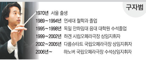 한국인으로는 처음 독일의 정상급 국립오페라극장의 수석상임지휘자가 된 구자범(具自凡·36) 씨는 ‘음악 천재’다. 대학에서 철학을 전공한 뒤 스물다섯의 나이에 뒤늦게 독일 만하임대 음대로 유학을 떠난 그가 10년 만에 하노버 국립오페라극장의 수석상임지휘자로 세계적인 지휘자의 반열에 설 수 있었던 바탕에는 타고난 절대음감이 있는 게 사실이다.