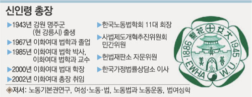 신 총장은 노동운동가 출신의 노동법 전문가다. 이화여대 법대 학생회장 시절 한일 굴욕외교 반대시위를 주도하다 정학을 당했고 공장 노동자들에게 노조민주화 교육을 했다는 이유로 1년 가까이 옥고를 치르기도 했다.