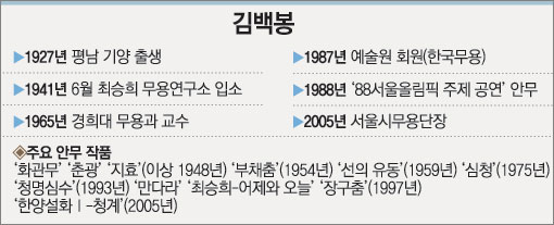 ‘부채춤’과 ‘화관무’를 만든 김백봉(金白峰) 서울시무용단장. 광복 후 한국 무용계에서 서양무용과 한국무용이 결합된 ‘신무용’ 장르를 개척해 온 그가 올해로 팔순을 맞았다. 13, 14일 세종문화회관에서는 ‘한국 신무용 80년사(史)와 김백봉 예(藝)의 삶’이란 제목으로 제자들이 그의 춤 인생을 기리는 공연을 헌정한다. 70여 명의 무용수가 ‘부채춤’, ‘화관무’, ‘섬광’, ‘장구춤’, ‘만다라’ 등 김 씨의 대표작들을 무대에 올린다.