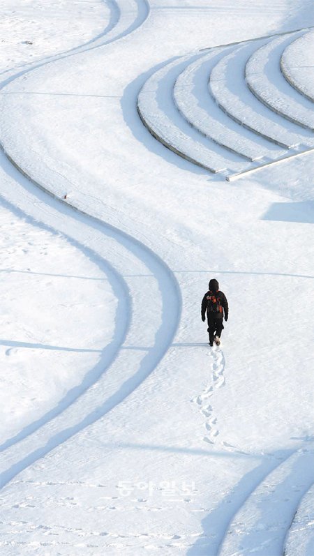‘버석대는 명아주 꽃대궁을 밟으며/느릿느릿 걸어오는 첫눈 아침이 있다//뽀얗게 껍질 벗는 버짐나무 줄기를 걷어차며/터벅터벅 걸어오는 아침 첫눈이 있다’(이은봉 ‘첫눈 아침’에서) 이른 아침 소복이 눈 쌓인 여의도 한강공원을 한 남자가 터벅터벅 걸어갑니다. 남자 뒤로 발자국이 터벅터벅 따라갑니다. 하얀 눈밭은 언제 봐도 아름답습니다. 빙판길, 질퍽한 바닥이 걱정되기도 하지만 눈 오는 날 풍경의 설렘에 이런저런 근심도 사뿐하게 덮입니다.