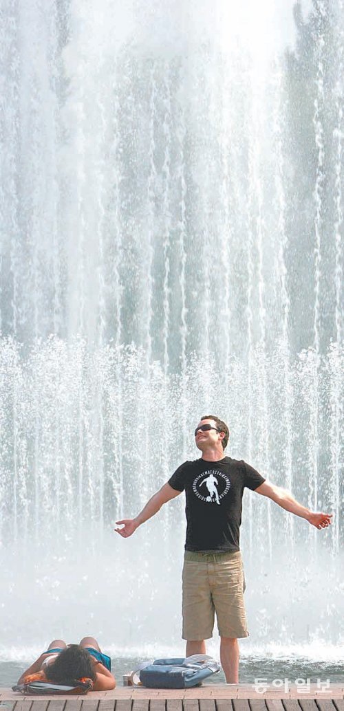 숨을 헉헉 막히게 하는 이 무더위. 피할 수 없으면 즐기는 것은 어떨까요. 서울 마포구 상암동 서울월드컵경기장 분수대 앞에서 시원하게 더위를 즐기는 이 외국인 커플처럼 말입니다.