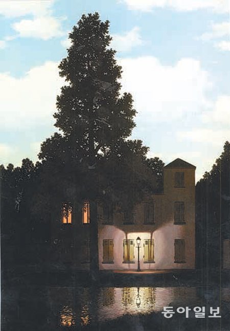한참 보고 있어도 질리지 않는다. 파란 하늘에 둥실 뭉게구름이 떠 있고, 그 아래 어둠으로 둘러싸인 저택 앞에 불 밝힌 가로등 하나. 거인처럼 우뚝 솟은 나무, 인적 없는 거리, 집 창문에서 새어나오는 희미한 불빛이 어우러진 그림은 고즈넉함과 불안감을 동시에 드러낸다. 최근 이탈리아 베네치아로 출장 갔다 그곳 페기 구겐하임 미술관에서 벨기에 출신 초현실주의 화가 르네 마그리트(1898∼1967)의 1954년 작 ‘빛의 제국’과 만났다. 그는 세상을 뜰 때까지 20년간 ‘빛의 제국’ 연작을 그렸는데 빛과 어둠, 낮과 밤, 꿈과 현실이 동전의 양면처럼 동거하는 낯선 풍경이 강렬한 인상을 남긴다. 모순된 요소를 창조적으로 뭉뚱그리는 전복적(顚覆的) 상상력에 철학적 사고를 융합한 천재성이 엿보인다.