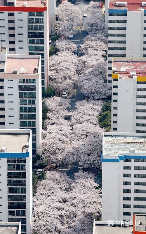 바야흐로 벚꽃의 계절입니다. 하늘에서 내려다보니 부산 남천동의 아파트단지도 벚꽃으로 물들었습니다.