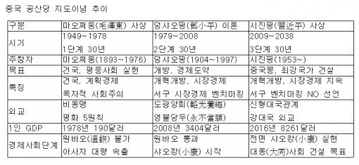 시 총서기가 18일 3만1900자에 이르는 당 대회 업무 보고를 3시간 24분간 낭독하면서 가장 많이 외친 것은 ‘중국특색 사회주의’로 무려 69차례였다. 다음이 ‘중화민족의 위대한 부흥’으로 32차례나 됐다. 이들 학자들은 1949년 사회주의 중국 건국 이후 첫 30년은 마오의 사상이, 1979년 이후 30년은 덩의 사상이 지배했으며, 2009년 이후 30년은 시진핑 사상으로 무장해야 한다고 주장한다. ●“서구 모방의 시대 끝났다” 선언