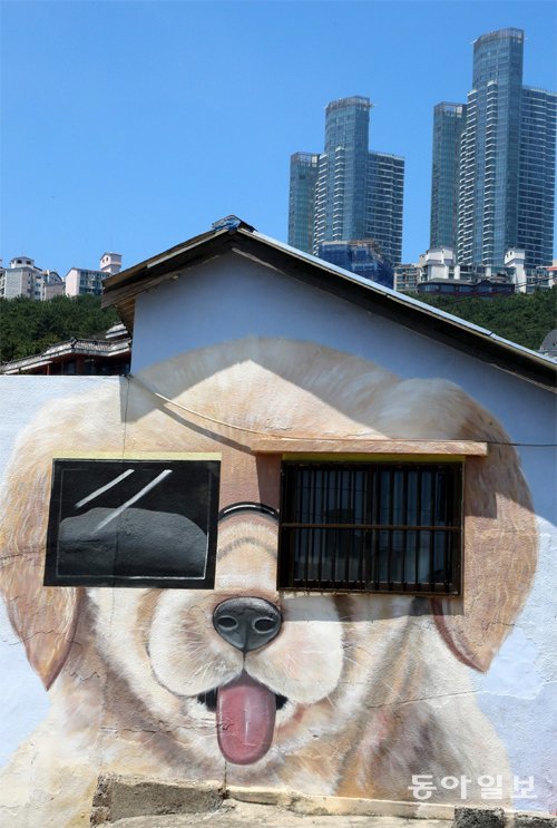 화려한 고층 건물 아래 허름한 집. 선글라스 낀 강아지는 오히려 세상을 놀려댑니다. 같은 세상 다른 곳에 살지만 어느 곳에서 더 많은 웃음소리가 들릴까요. 개의 눈이 더 정확한 것인가요.