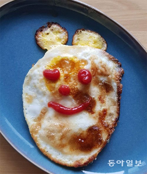 손이 거친 아빠가 모처럼 주방에 섰습니다. 달걀 프라이를 하다가 그만 노른자가 조금 터졌네요. “어유, 계란 프라이에 귀가 생겼네.” 케첩으로 아내와 아이들에게 ‘스마일 선물’.