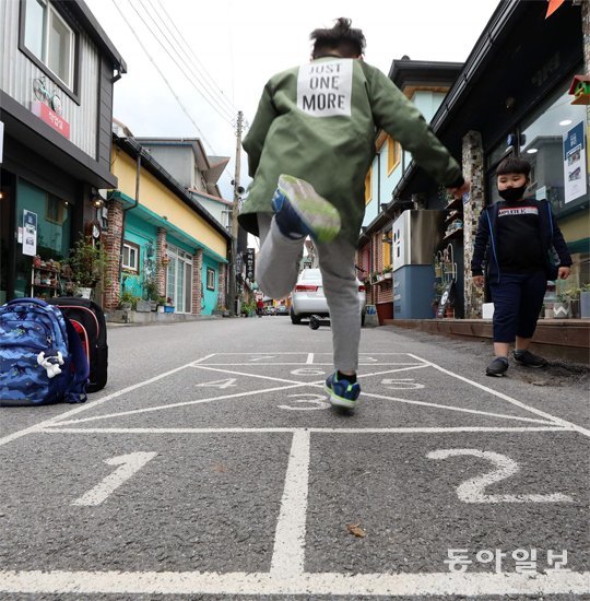 어릴 적 아이들의 최고 놀이였던 사방치기가 강원 정선군 고한읍의 한 골목길에 그려져 있네요. 요즘 아이들은 과연 사방치기를 알까요? 가방을 잠시 내려놓은 학생이 어떤 놀이인지 모르면서 신나게 뛰어봅니다.