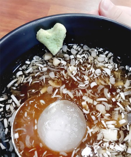 감칠맛 나는 시원한 국물에 사각사각 얼음이 동동. 알싸한 고추냉이 하트 한 점은 넉넉한 사장님의 마음.