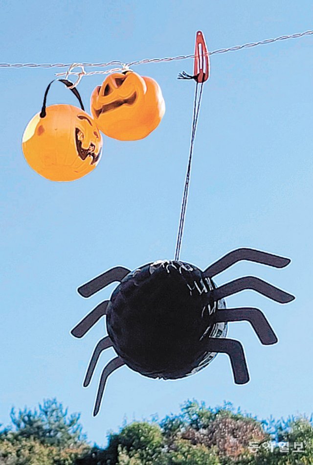 거미가 줄을 타고 올라갑니다. “호호호” “하하하” 호박 바구니와 호박 전구가 재미있게 지내는 듯한 모습에 동참하고 싶었나 봅니다.―경기 포천시에서