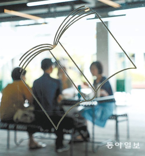 유리창의 책 그림 너머, 독서 토론하는 사람들이 보이네요. 선선한 가을, 책의 온기를 느껴 보면 어떨까요. ―서울 노들섬에서