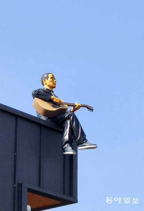 파란 하늘을 배경 삼아 기타 치는 연주가. 보는 이의 마음까지 시원하게 뚫리는 것 같네요.