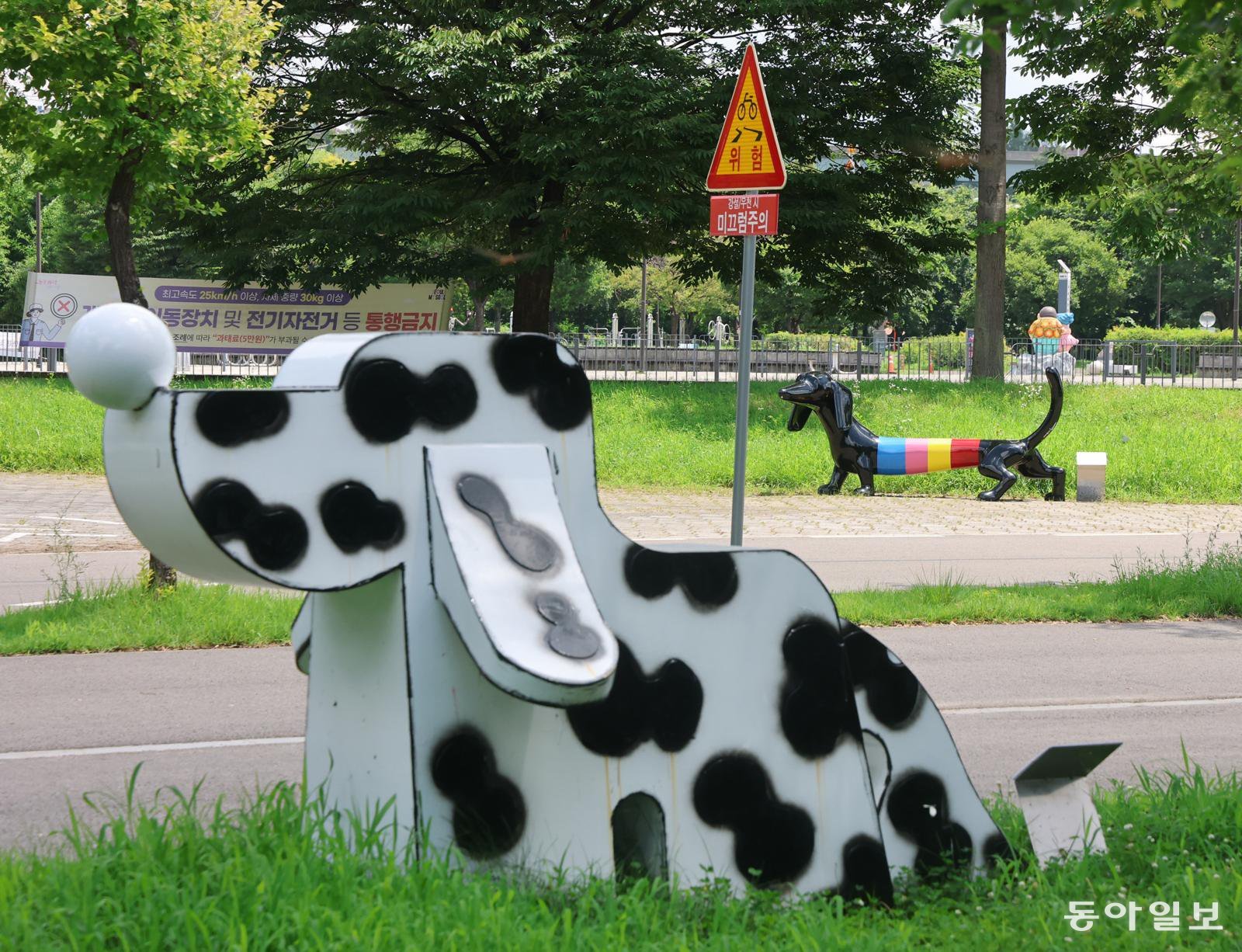 한강공원을 걷다 강아지 조각상을 만났습니다. 흰색과 검은색이 조화를 이룬 점박이, 색동의 화려한 옷을 입은 검은 강아지가 공원에 생동감을 불어넣네요.