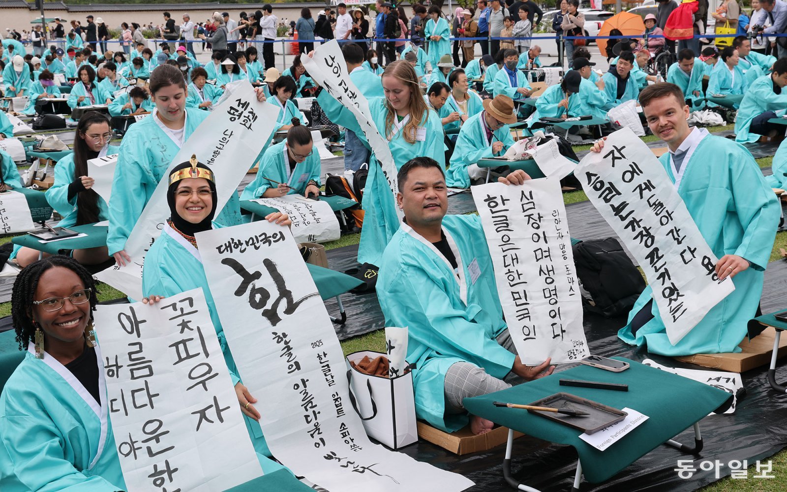 제579회 한글날인 9일 오전 서울 종로구 광화문광장에서 열린 ‘한글창제 579주년 기념 광화문광장 휘호대회’에서 외국인 참가자들이 자신들이 쓴 한글을 들어 보이고 있다. 홍진환 기자 jean@donga.com