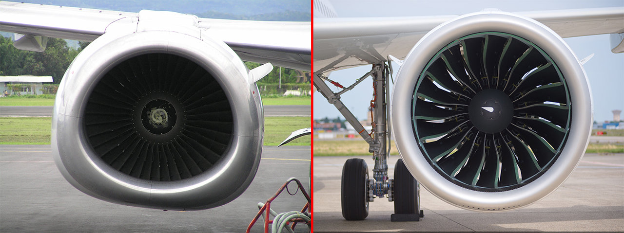보잉 737-400 기종의 엔진(왼쪽 사진)과 에어버스 320 기종의 엔진. 737의 엔진이 위아래로 납작한 것을 볼 수 있다.