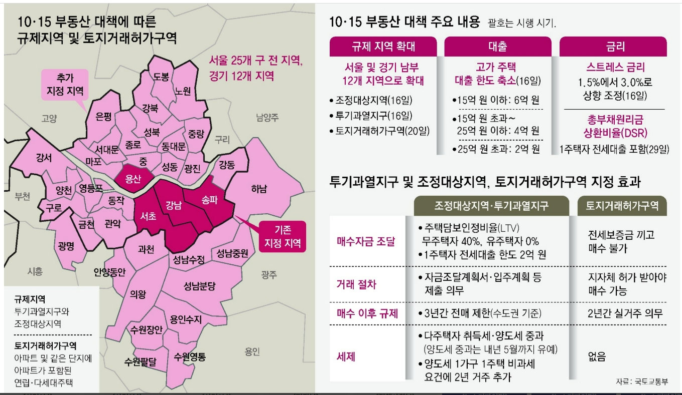 ‘10·15 대책’의 핵심은 이미 규제지역으로 묶여 있던 서울 강남 3구(서초·강남·송파구)와 용산구를 포함한 서울의 25개 전체 자치구, 경기 과천·광명시, 성남시 분당·수정·중원구, 용인시 수지구 등 12개 지역을 토지거래허가구역·투기과열지구·투기과열지역으로 묶어 ‘3중’으로 규제하는 것이다. 이곳에 집을 사려면 지방자치단체장의 허가를 받아야 하고, 2년간 본인이 실거주해야 한다.