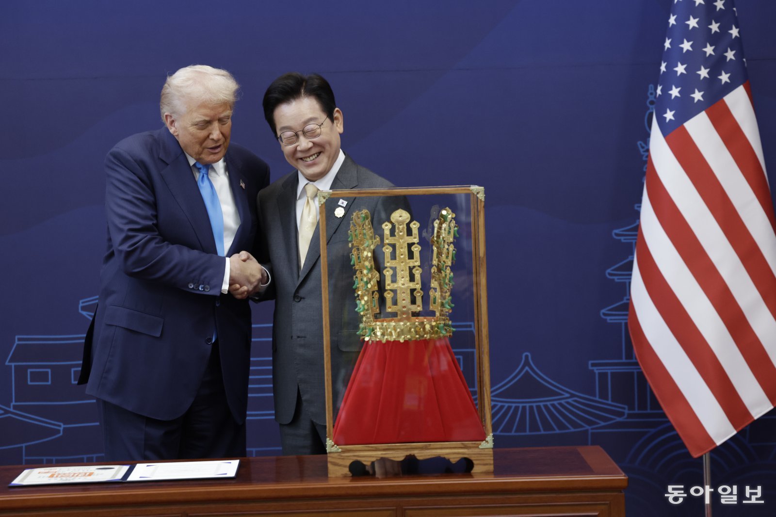 이재명 대통령이 29일 경북 경주시 국립경주박물관에서 열린 한미 정상회담에 앞서 도널드 트럼프 미국 대통령에게 무궁화 대훈장을 수여하고 천마총 금관 모형을 선물한 뒤 악수하고 있다. 경주=송은석 기자 silverstone@donga.com
