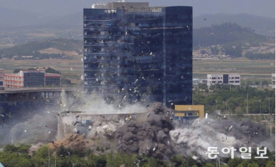 나흘 뒤 북한은 진짜로 이 연락사무소 건물을 폭파했다. 폭약을 얼마나 썼던지 70m 떨어진 15층짜리 개성공단 종합지원센터 건물 유리창이 다 박살 났다. 하지만 정작 형체도 없이 무너뜨리겠다던 건물은 높이 솟구쳤던 폭파 먼지가 가라앉은 뒤에도 꿋꿋이 서 있었다.