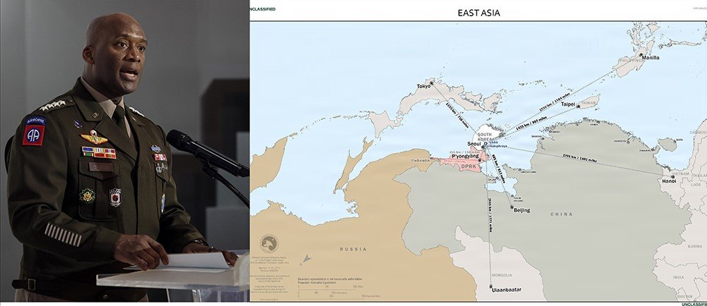 제이비어 브런슨 주한미군사령관이 17일 위아래를 뒤집어 그린 동아시아 지도를 공개하면서 한국이 북한뿐 아니라 중국, 러시아의 위협을 억제할 전략적 중심축이라고 밝혔다. 그간 북한 방어에 맞췄던 주한미군의 핵심 역할이 중-러를 군사적으로 압박하는 방향으로 바뀌고 있다고 분명히 한 것이다. 실제 브런슨 사령관은 주한미군이 서해에서 중국 육해공군, 동해에서 러시아 함대를 견제할 수 있다는 구체적 방안까지 언급했다.