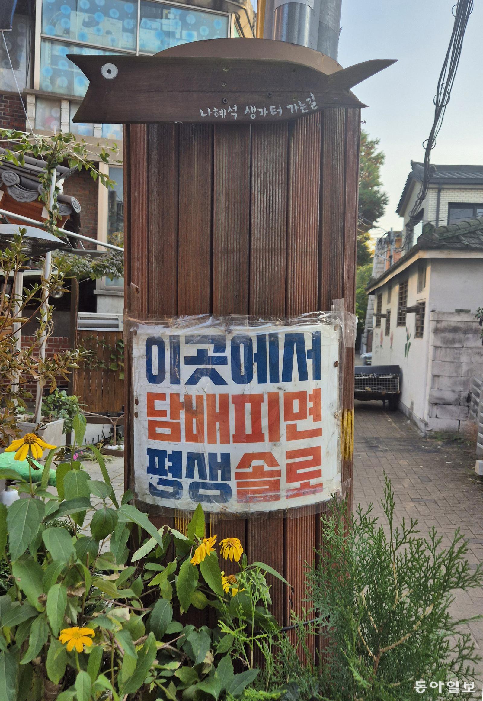 여기에서 담배를 피우면 평생 애인을 못 둔다네요. 익살스러운 농담 속에도 금연 예절을 지켜 달라는 단단한 일침이 느껴집니다.