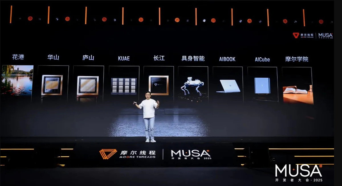 중국 반도체 기업 무어스레드의 장젠중 창업자가 20일 개발자 콘퍼런스에서 ‘화산’과 ‘루산’ 등 차세대 칩을 공개하고 있다. 무어스레드 제공