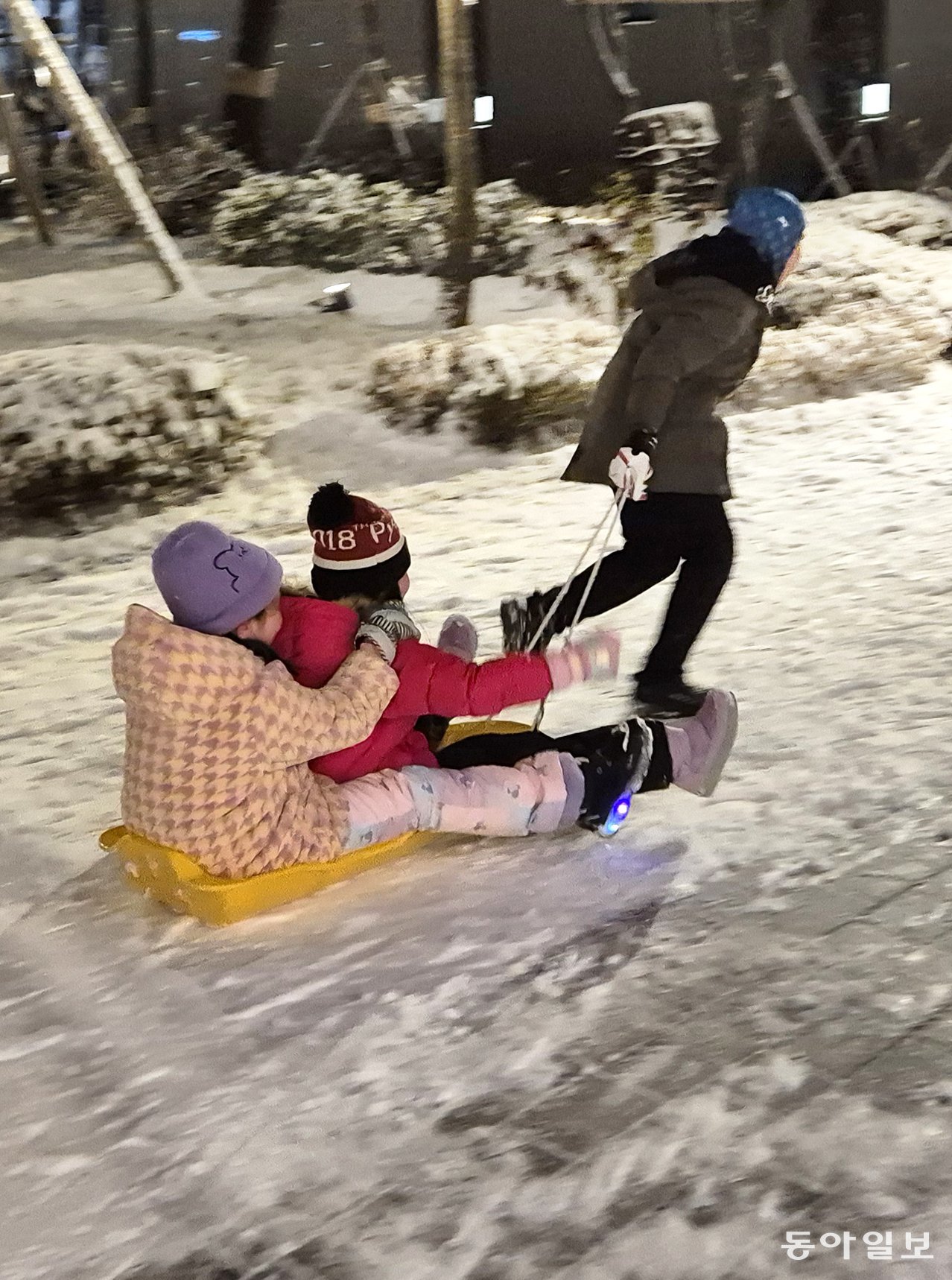 눈 쌓인 길 위에서 아이가 있는 힘껏 썰매를 끕니다. 친구들을 태운 채 달리는 골목이 겨울밤의 놀이터가 됐습니다.