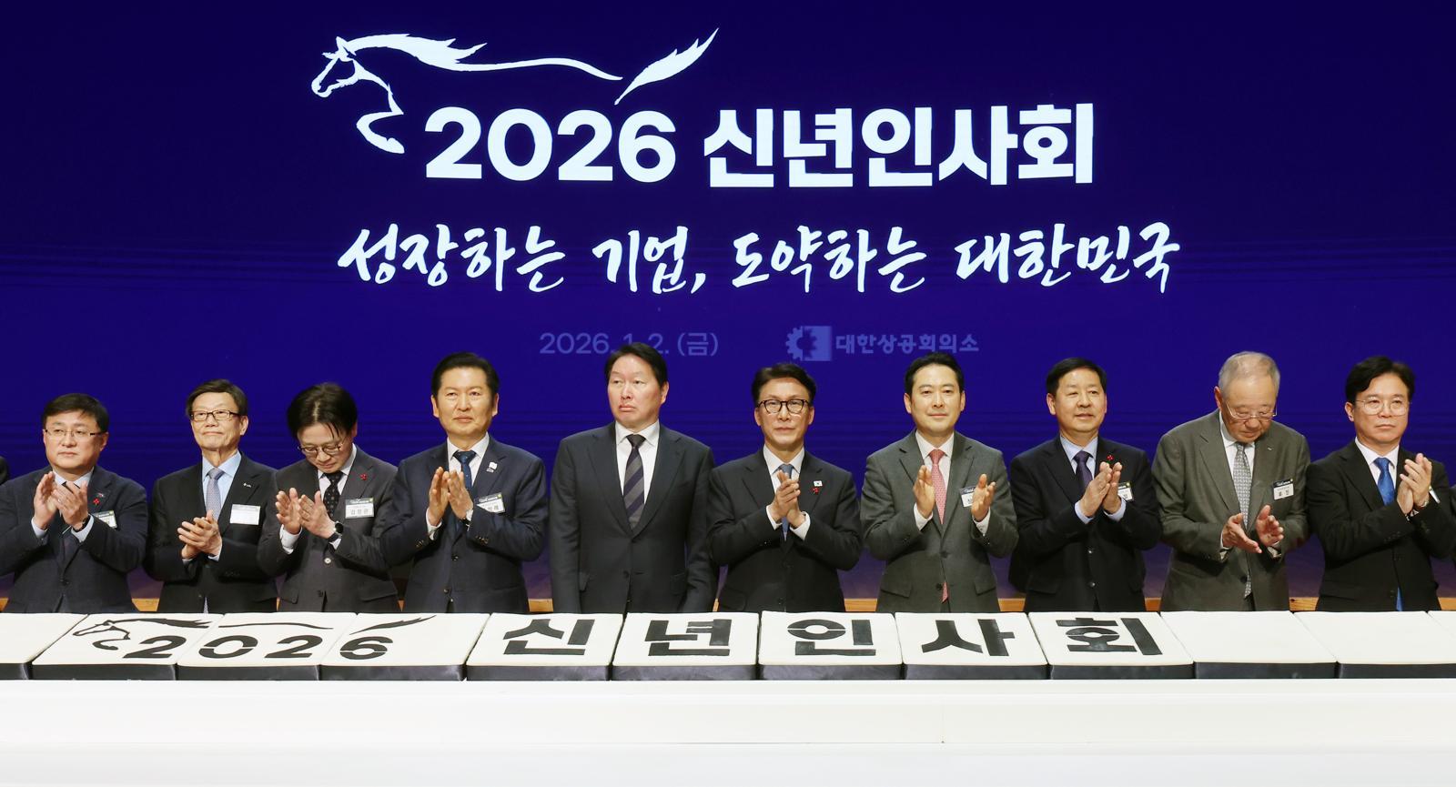 김민석 국무총리와 최태원 대한상공회의소 회장 등 참석자들이 2일 오후 서울 중구 대한상공회의소에서 열린 2026 경제계 신년인사회에서 떡케익 커팅식 후 박수치고 있다. 사진공동취재단