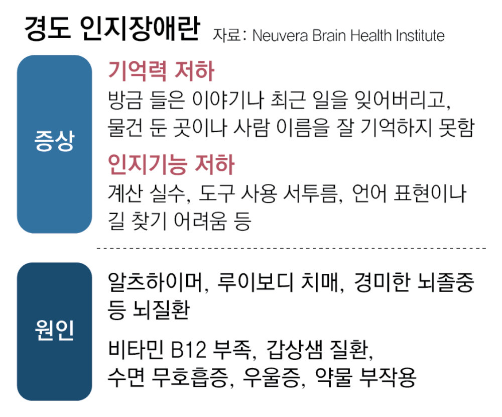 경도 인지장애의 원인은 크게 두 가지로 나눌 수 있다. 첫째는 알츠하이머병, 루이보디 치매, 작은 뇌졸중 같은 것들이 원인인 경우다. 둘째는 비타민 B12 부족, 갑상샘 질환, 수면 무호흡증, 우울증 또는 약물 부작용이 원인인 경우다.