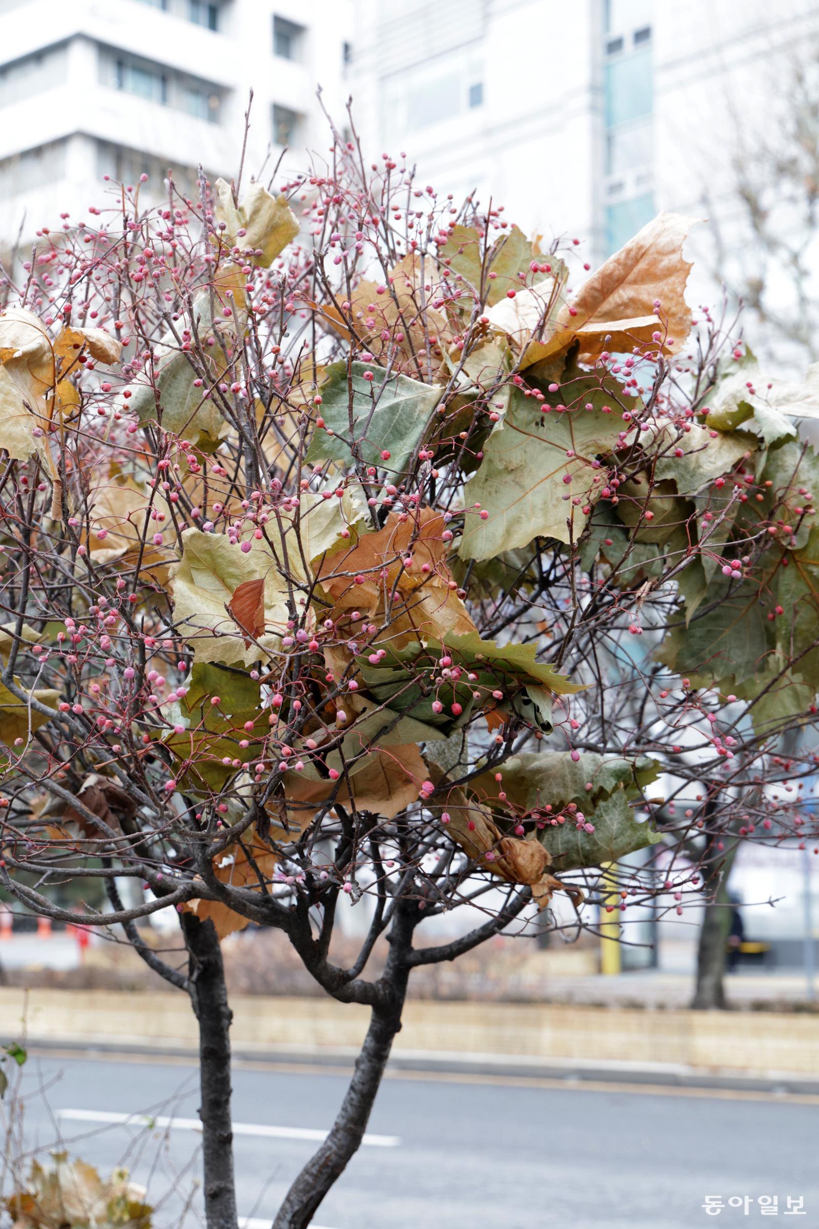 양버즘나무(플라타너스)에서 떨어진 잎이 팥배나무 위로 내려앉았습니다. 사뭇 다른 두 조합이 거리에 새로운 풍경을 만들어냅니다.