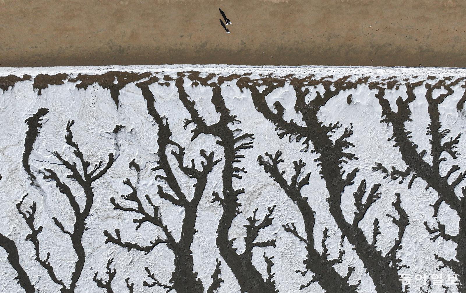 겨울의 찬 바람이 바다 위에 하얀 도화지를 펼칩니다. 썰물이 빠져나가며 그 위에 나뭇가지를 정성스레 새겨 넣습니다. 차갑기만 할 줄 알았던 계절이, 자연의 손으로 따뜻한 그림 한 장을 내어놓네요.
