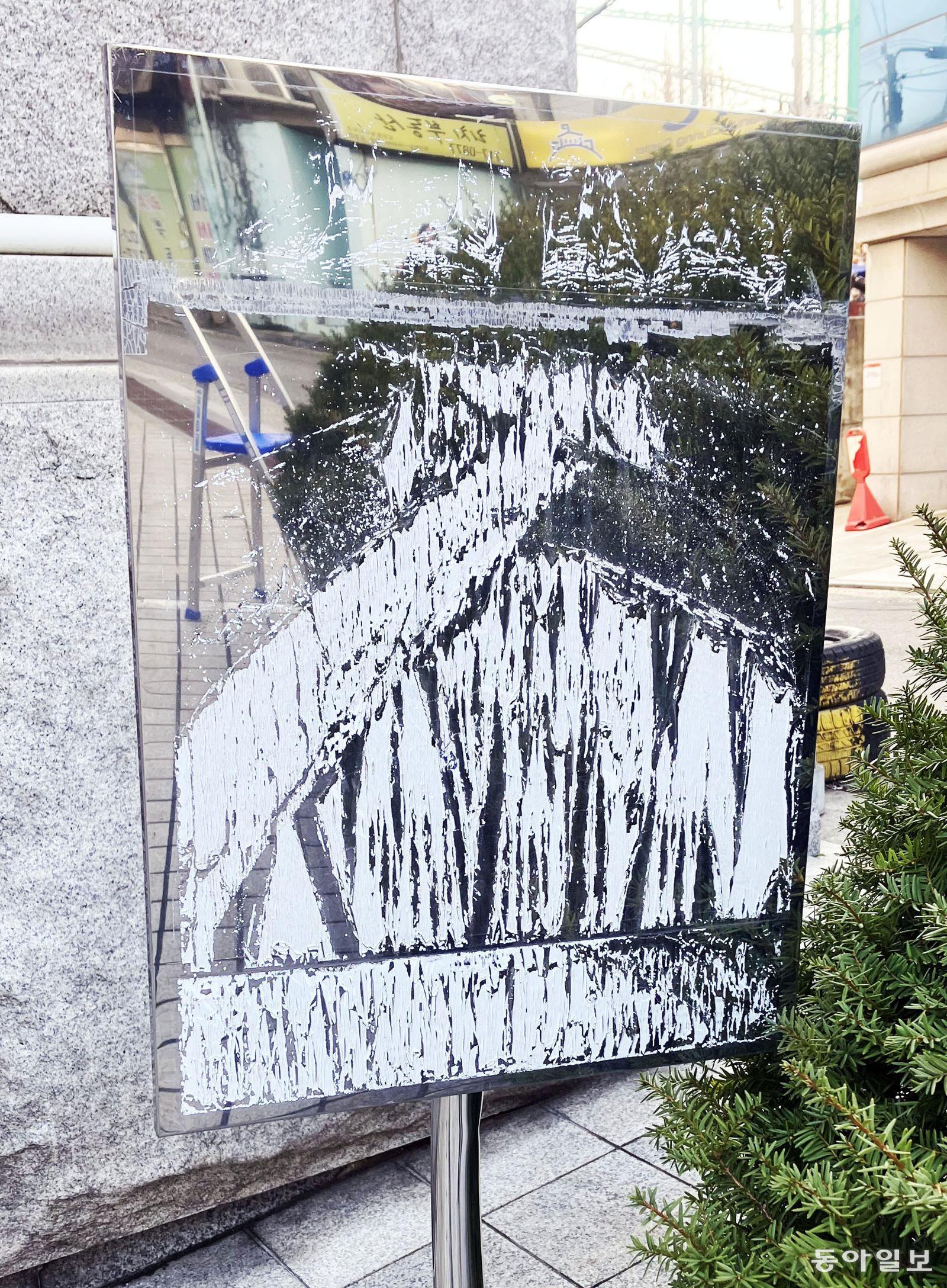 한때 ‘주차 금지’ 같은 문구가 적혀 있었을 법한 안내판이, 칠 자국만 남긴 채 말을 지웠습니다. 이젠 길가에 세워진 추상화 캔버스처럼 보이네요.