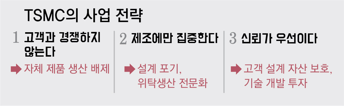TSMC는 창업 초기부터 세 가지 원칙을 분명히 했다. 첫째, 고객과 경쟁하지 않는다. 둘째, 제조에만 집중한다. 셋째, 기술 개발에 아낌없이 투자해 신뢰를 쌓는다. 이 원칙들은 단기 수익보다 장기적인 신뢰와 축적을 위한 선택이었다.