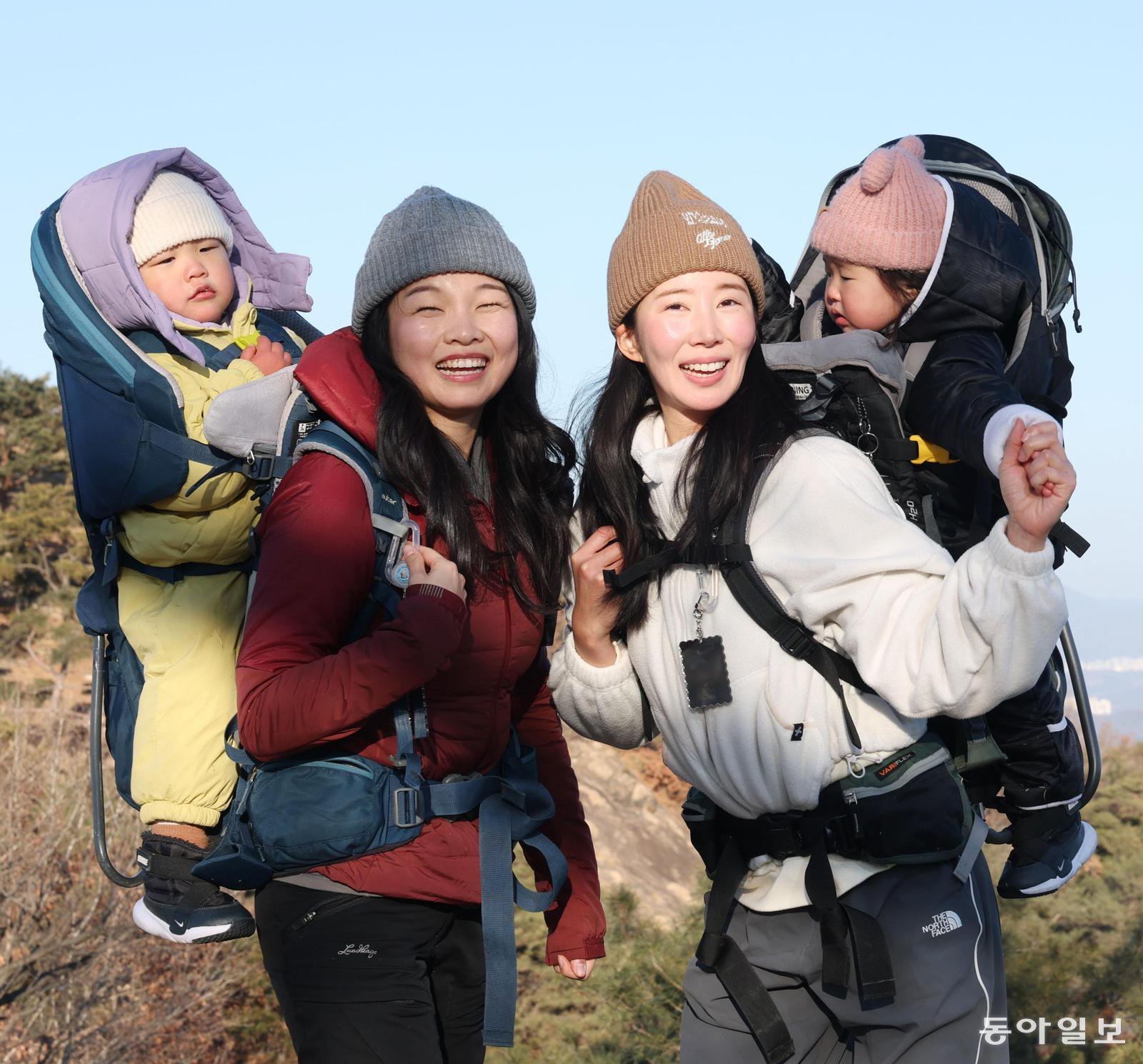 오언주 베이비하이킹클럽(베하클) 회장(왼쪽)과 김지영 씨가 각각 아들(인주호)과 딸(강다경)을 업고 서울 광진구 아차산 해맞이코스 1보루에 올라 활짝 웃고 있다. 2024년 9월부터 베하클을 운영하고 있는 둘은 “아이를 업거나 안고 산에 오르니 아이도 좋아하고 우리도 행복하다”고 입을 모았다.