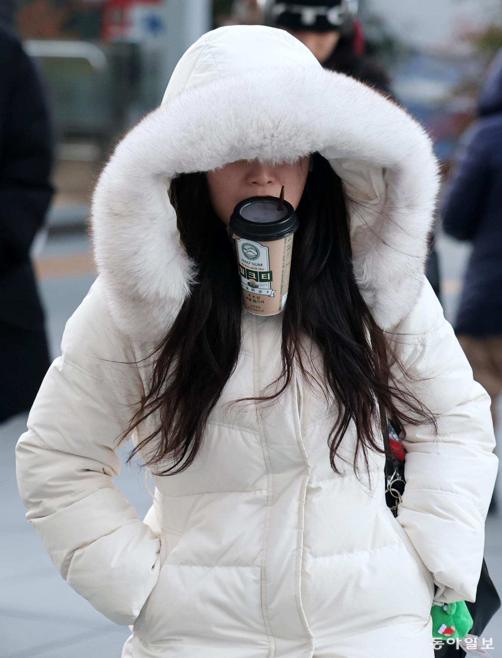 두 손은 패딩 주머니에 넣었지만, 음료는 포기할 수 없는 아침입니다. 털모자를 눌러쓰고 발걸음을 재촉하며, 북극 한파에 생존형 출근법이네요.