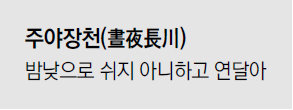 왜냐하면 ‘주야장천(晝夜長川)’이라는 말이 두 눈을 시퍼렇게 뜨고 살아 있기 때문입니다. 즉, 주구장창은 주야장천의 잘못된 쓰임입니다. ‘주야’는 밤과 낮을 의미하고, ‘장천’은 오래도록 흐르는 물을 뜻합니다. 따라서 ‘밤낮으로 연달아’라는 의미가 자연스럽게 생겨난 것 같습니다.