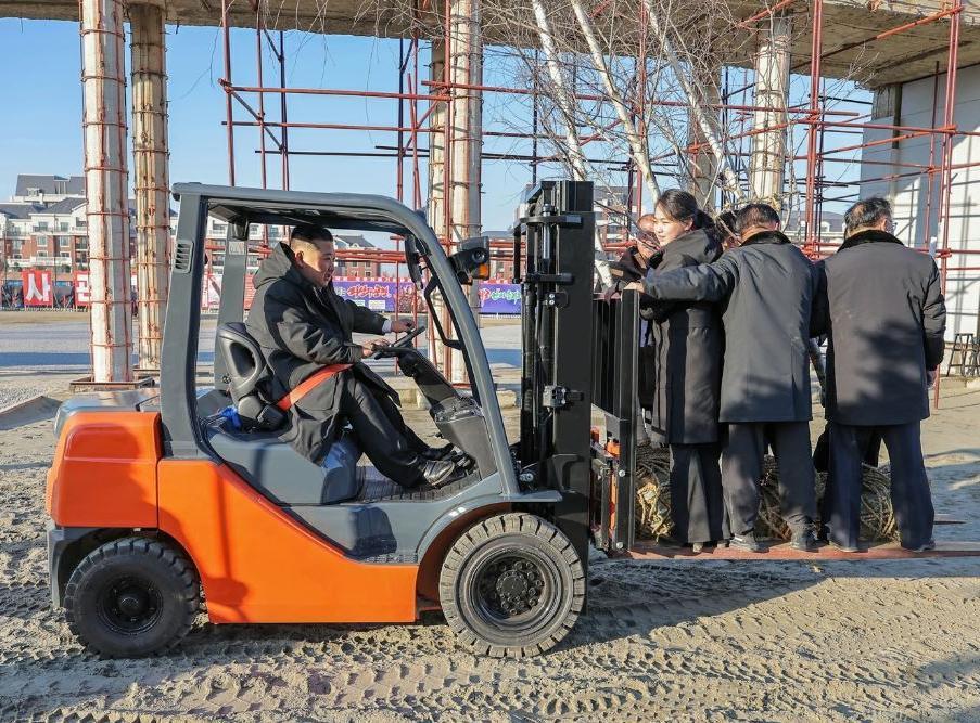 김정은(왼쪽)이 5일 가족과 함께 ‘해외군사작전 전투위훈기념관’ 건설 현장을 찾아와 신난 표정으로 딸 김주애(오른쪽에서 세 번째)와 관계자들 그리고 기념 식수용 나무들을 지게차에 태워 몰고 있다. 노동신문 뉴스1