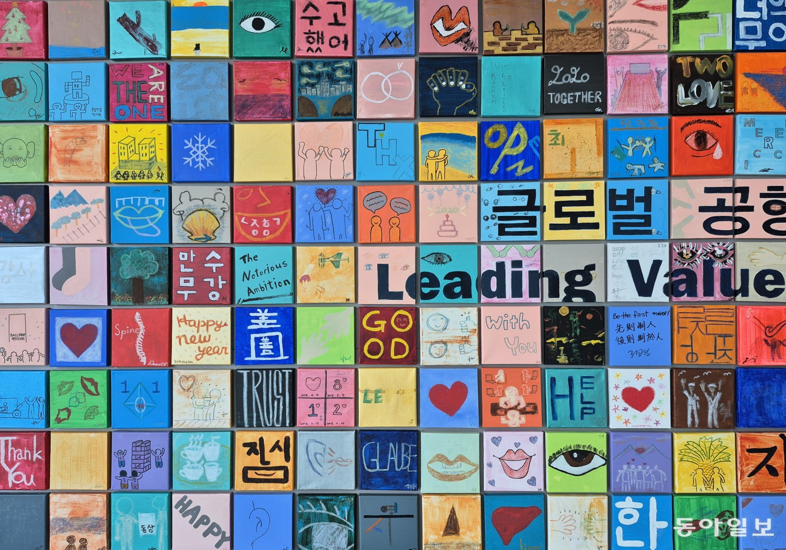 응원 메시지가 담긴 각각의 그림들이 모여 벽 한가득 이야기를 쏟아냅니다. 한 발짝 물러서서 보니 지친 하루를 토닥이는 벽 같습니다.