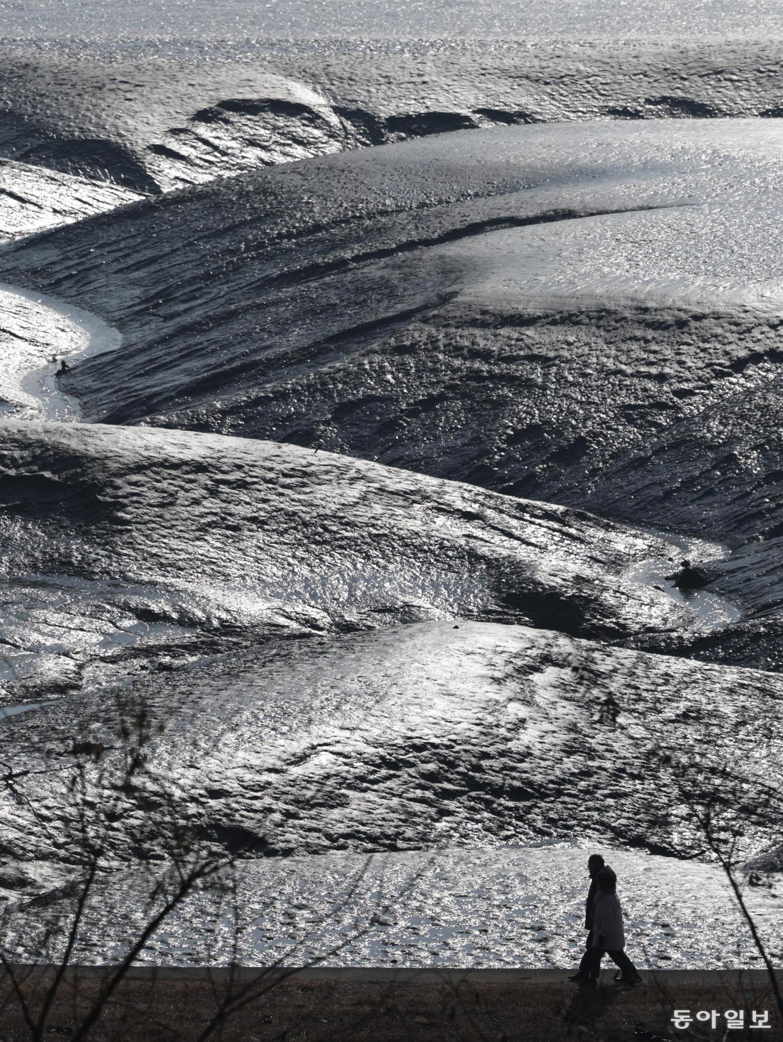 겨울 바다를 보러 나온 사람들이 해변가 산책로를 걷고 있네요. 바닷물 대신 펼쳐진 펄밭처럼 쉽지 않은 날도 있지만, 그래도 힘껏 헤쳐가야겠지요.
