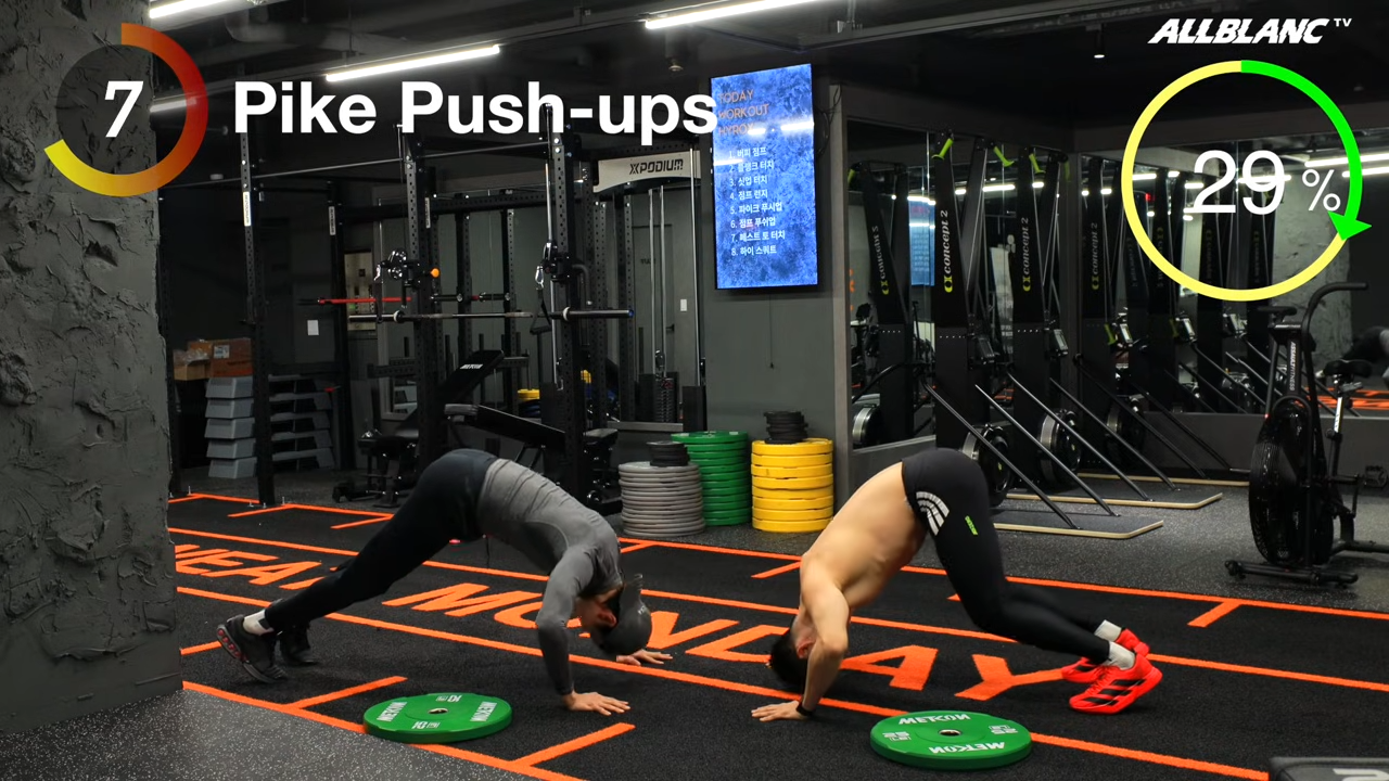 파이크 푸쉬업은 어깨 삼각근을 집중적으로 강화한다. 엉덩이를 높이 들어 역 V자 자세에서 하며, 월 볼을 던지거나 슬레드를 밀 때 필요한 어깨 힘을 제공한다. 플랭크 숄더 터치는 코어 전체를 강화한다. 플랭크 자세에서 한 손씩 번갈아 반대편 어깨를 터치하면서 몸통이 흔들리지 않도록 버티는 것이 핵심이며, 이를 통해 항회전력을 키운다.