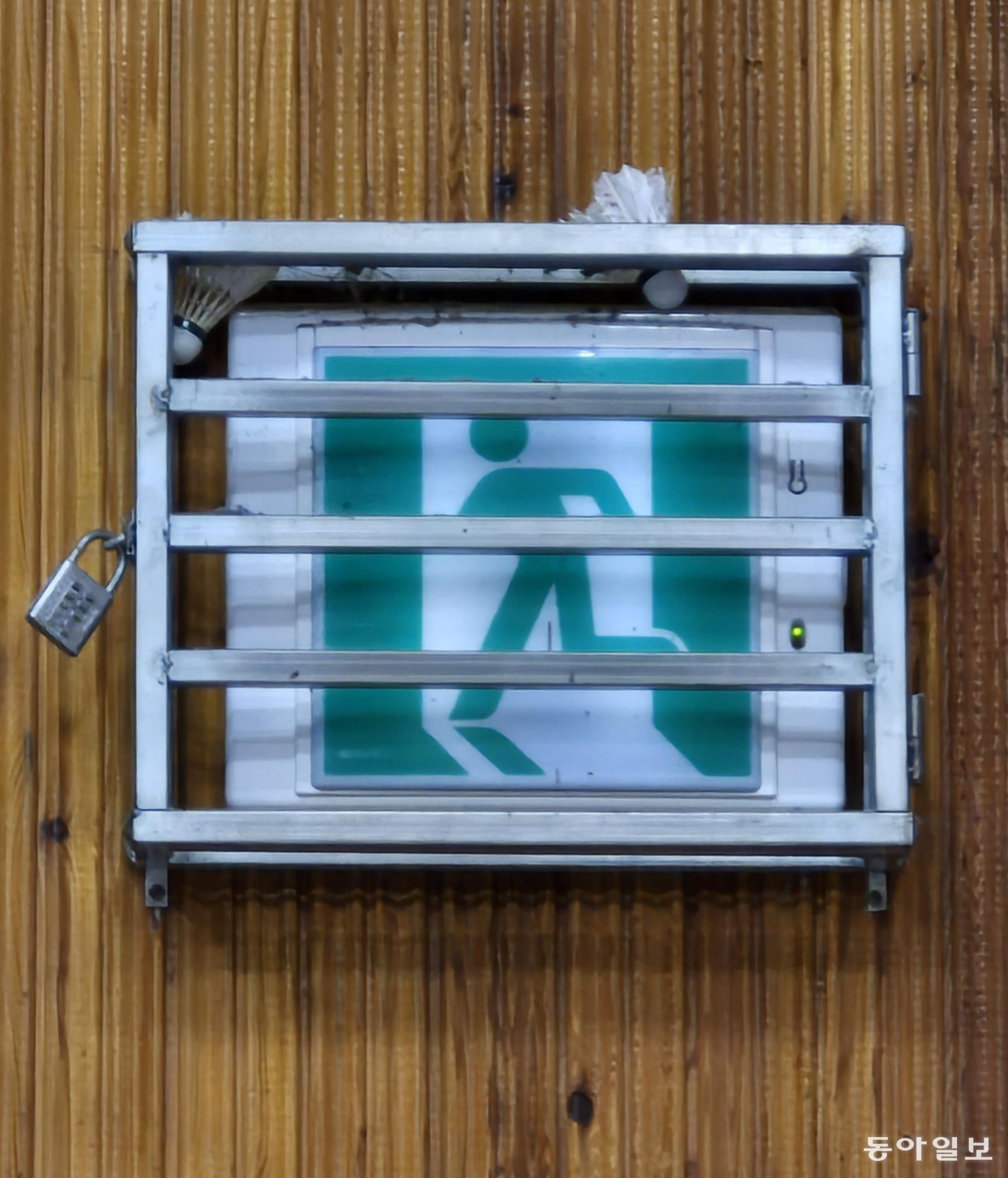 비상구 유도등이 철창에 갇혔습니다. 마음은 급하고 헤쳐 나가야 할 길은 멀어 보입니다. 그래도 유도등 속 인물은 희망을 향해 달립니다.