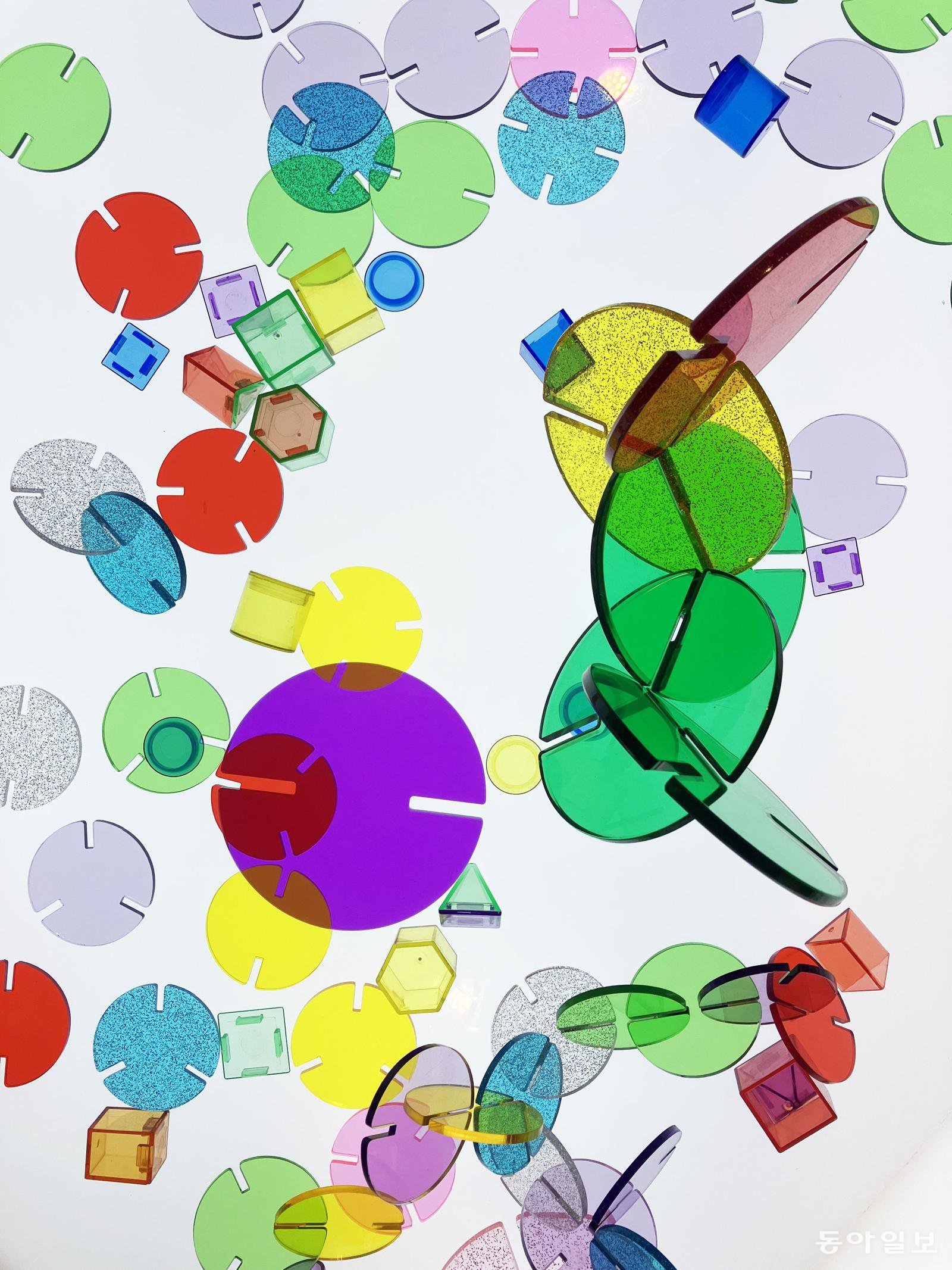 달을 주제로 한 체험 전시회에서 아이들이 아크릴 조각을 맞춰 다채로운 달을 만들었습니다. 밤하늘의 달도 이렇게 알록달록한 색이라면 어떨까요.