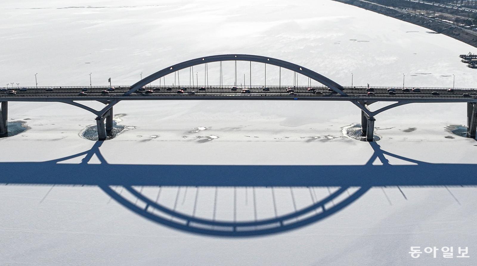 아치형 다리가 흰 눈으로 덮인 한강 위에 자신과 닮은 그림자를 새겨 넣었습니다. 그림자 다리로 또 하나의 길이 생겼습니다. 입춘을 무색하게 하는 추위에 강줄기가 얼어붙었지만 나란히 길목을 지키니 그 길이 외롭지 않습니다.