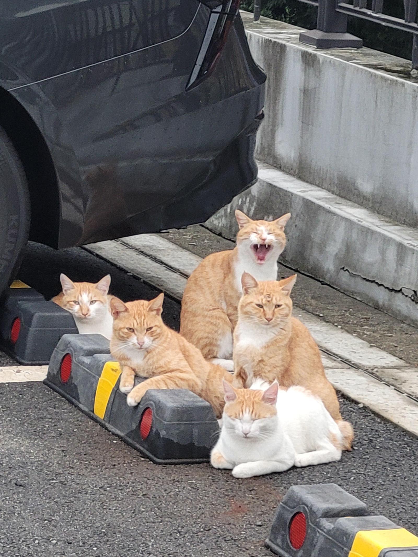 대대손손 공연장 앞을 지켜온 터줏대감 고양이 가족이 일제히 눈을 번뜩입니다. 날카롭지만 어딘가 귀여운 눈매로 “누가 우리 영역을 침범했지?”라고 묻는 듯하네요.