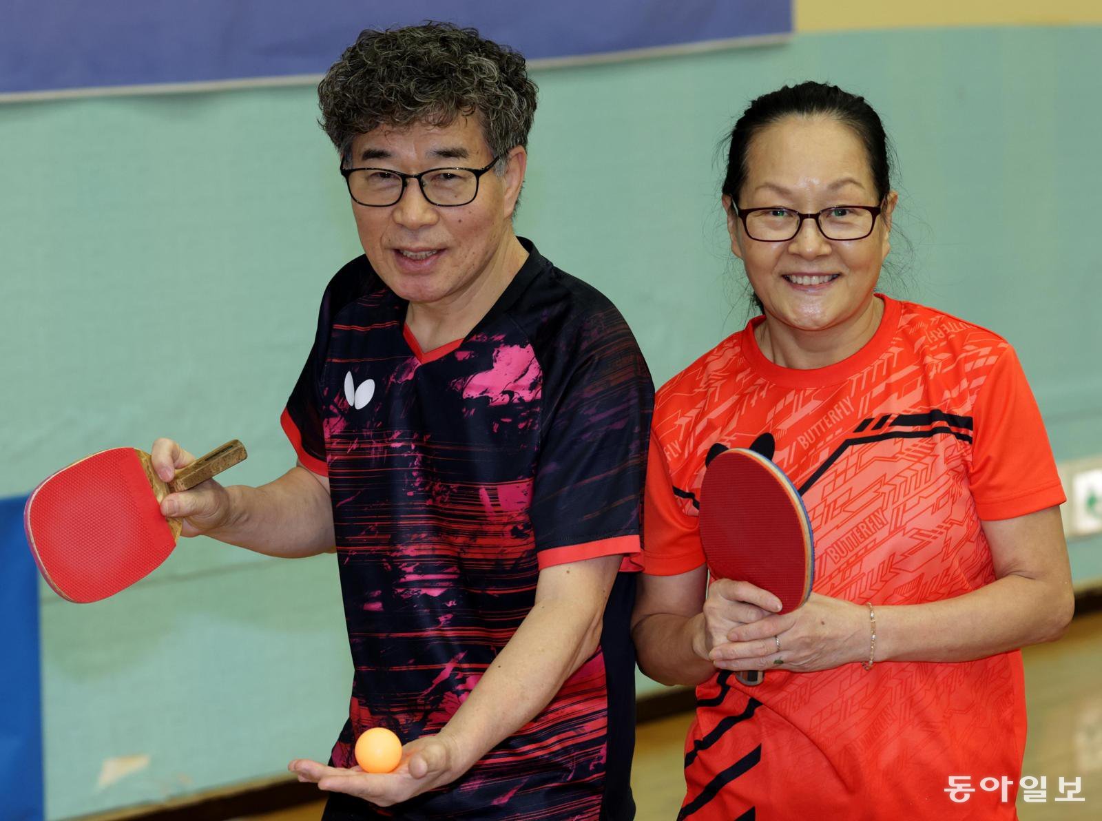 이동명(왼쪽), 김석순 씨 부부가 서울 강동구 코리아탁구체육관에서 라켓을 들고 활짝 웃고 있다. 30년 전 함께 탁구를 쳤던 부부는 서로 일 때문에 바빠 20여 년간 사실상 중단했다가 2024년 이 씨가 은퇴한 뒤 다시 라켓을 잡고 부부의 정을 쌓고 있다. 변영욱 기자 cut@donga.com