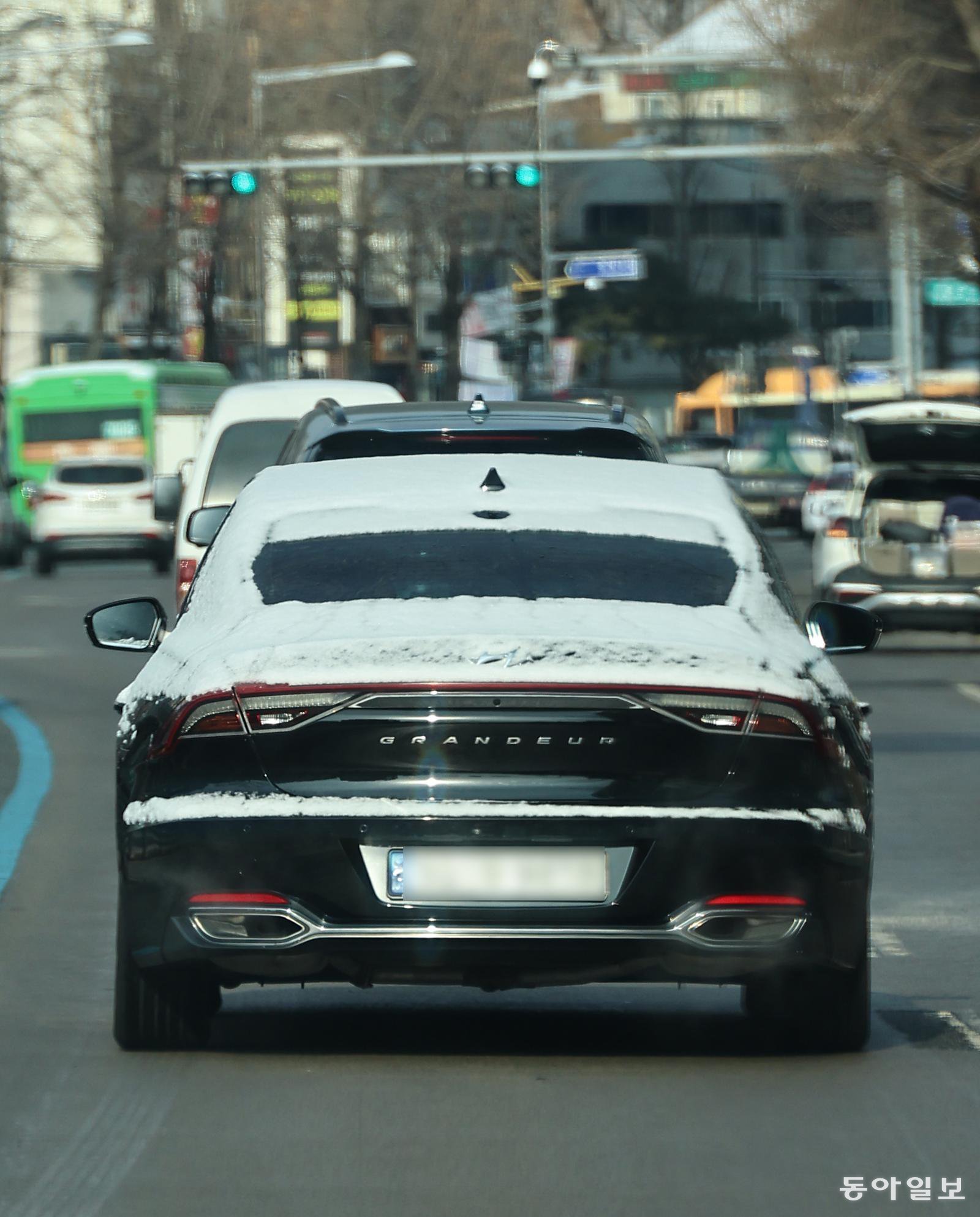 검은 차 위에 하얀 눈이 내려앉아 또렷한 흑백 대비를 이룹니다. 차는 미처 녹지 못한 눈을 이고 달립니다. 겨울에만 만날 수 있는 조합입니다.