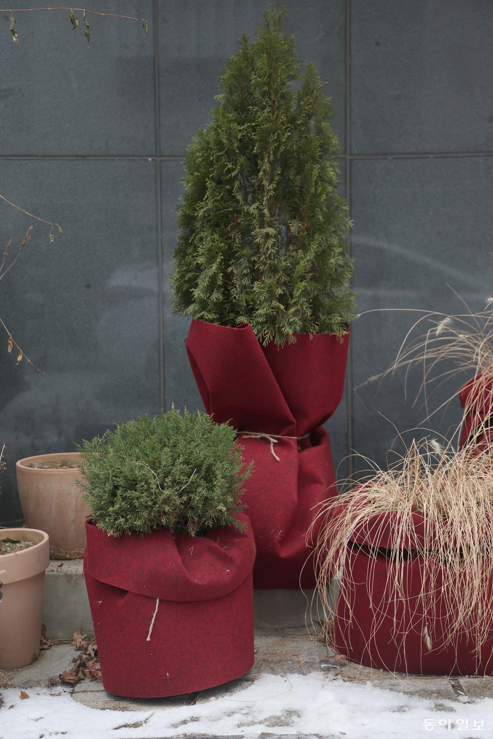 추운 계절을 버티라고 화분을 빨간 헝겊으로 감싸 두었네요. 길가에 놓인 작은 꽃다발 같습니다. 봄에 더 푸르게 피어나길 바라는 마음이겠지요.