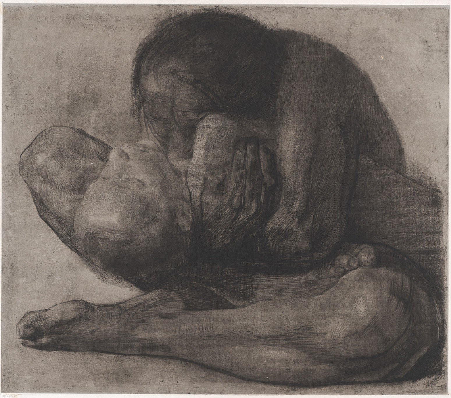 그림은 훗날 작가의 생을 덮칠 가혹한 복선이었다. 베를린 빈민가에서 가난한 이들을 돌보던 의사 남편을 통해 콜비츠는 질병과 빈곤 속에 어린 생명들이 속절없이 스러지는 현실을 가까이서 목격했다. 산업화의 그늘 아래, 아이의 죽음은 예외적 사건이 아니라 일상의 비극이었다. 그녀는 일곱 살 아들 페터를 모델로 삼고, 거울에 비친 자신의 나체를 스케치해 이 죽음의 포옹 장면을 완성했다. 그리고 11년 뒤, 그 아들 페터는 제1차 세계대전에서 전사한다. 이어 제2차 세계대전 중 손자까지 전장에서 잃으며 이 판화는 작가의 운명을 예견한 비극적 작품이 되고 말았다.