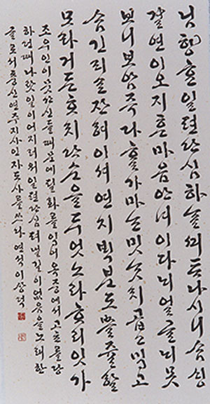 이밖에 특선에 구희자씨 등 54명, 입선에 강명순씨 등 436명이 수상의 영예를 안았다. 이번 서예대전에는 한글 한문 문인화 전각 서각 현대서예 등 6개 부문에 총 2248점이 출품됐다.